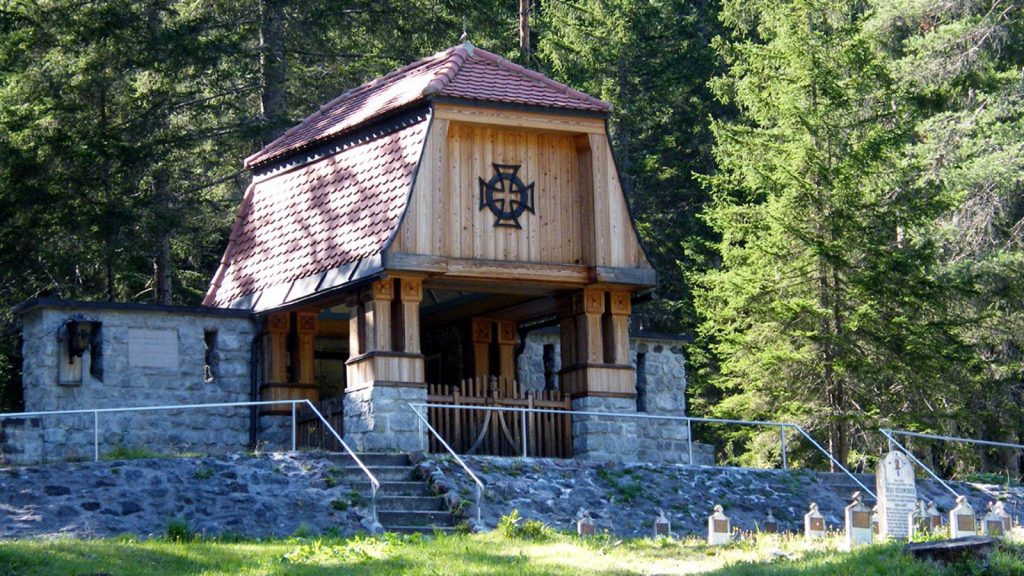 Il camposanto, situato all’ingresso della Valle, è stato ideato dal tenente Großschädel e realizzato in piena guerra dall’ing. Vydareny, per dare degna sepoltura non solo ai caduti dell’Impero Austroungarico, ma anche ai combattenti dell’esercito nemico stremati dalla guerra, dai freddi inverni in trincea e dalle nude rocce delle montagne che non hanno perdonato questi giovani.